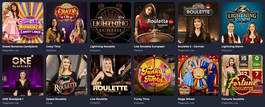 | Live Casino Spiele | Sweet Bonanza Candyland, Crazy Time, Lightning Roulette, Roulette 5 - German, ONE Blackjack, Speed Roulette, Speed Blackjack, Oasis Blackjack 2, Sic Bo, Video Poker, Crazy Pachinko, VIP Baccarat, Oasis Blackjack |